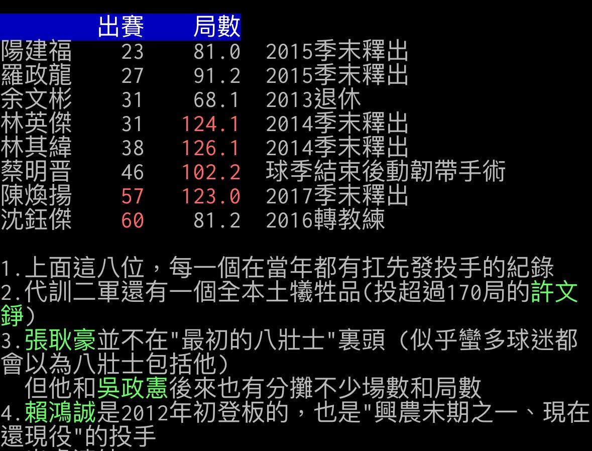 推 ccf0423: 興農八壯士,大概只有職棒元年的味全整季只用7個投手可以 04/26 01:56