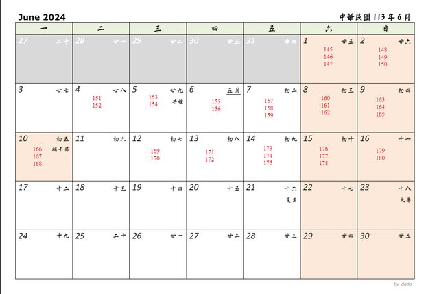 六月 6/10 星期一端午節排三地賽程, 6/11 休假, 其他照正常方式排