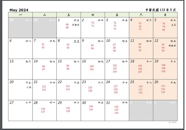 五月 5/1 勞動節較特殊就一樣排兩地, 所以都正常排