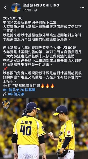 推 hnnihihi: 看起來只是球迷經營的粉專分享自己的看法 05/17 00:50