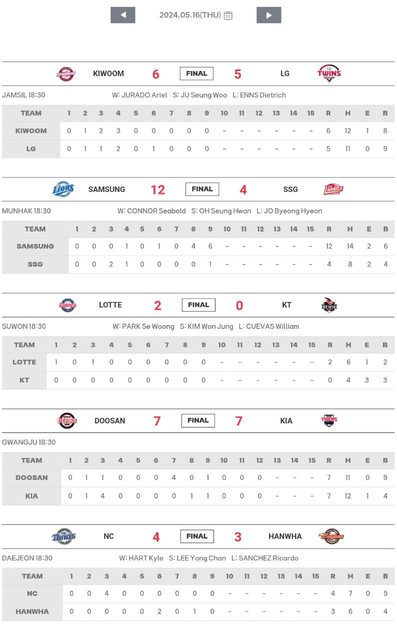 勝:Ariel Jurado(Kiwoom)(4勝)—5局,8H,2K,4BB,4R(3ER)(89球)