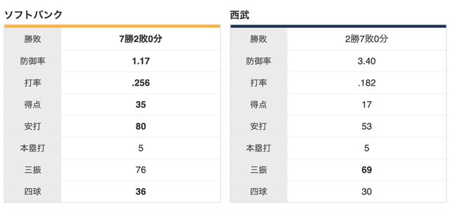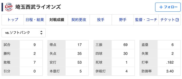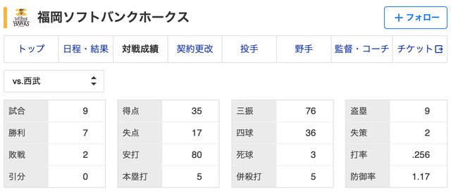 [雙方對戰成績]軟銀 7 勝,西武 2 勝