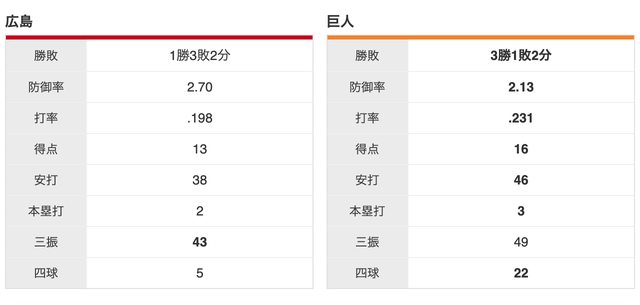 [雙方對戰成績]巨人 3 勝,廣島 1 勝,2 和