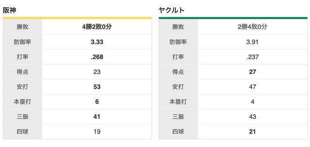 [雙方對戰成績]阪神 4 勝,養樂多 2 勝