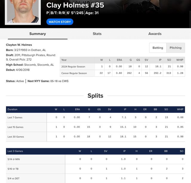 Clay Holmes四月中段以後到五月除了最近休太久那場以外其他表現也相當出色