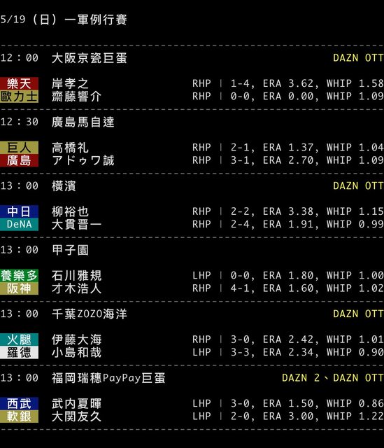 標題[情報] NPB 5/19 預告先發