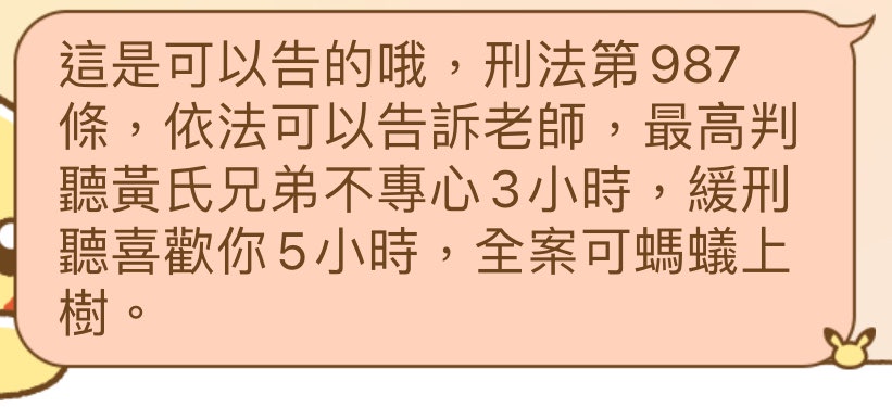 推 cyesgin: 這是可以告的喔,刑法第987條,依法可以告訴老師,最高判 07/08 16:26