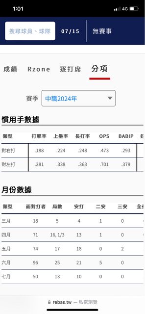 推 b1236711: 對左打還比聯盟左右打平均糟 263 333 363 07/15 15:50