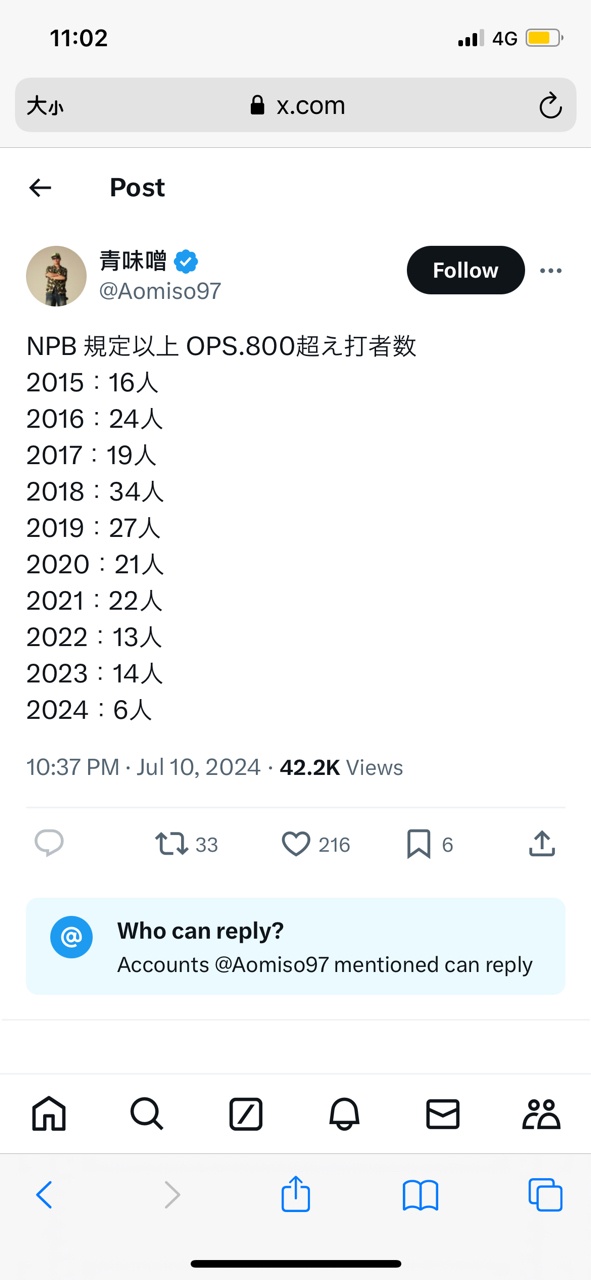 → jeff1013: 今年是整個聯盟規定打數內不到十個OPS破0.8 07/18 23:07