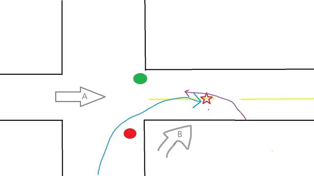 大家好 昨天遭遇一起車禍,想請鄉民們提供意見 雙方都是機車、對方無碰撞自摔 我是綠燈,對方紅燈,黃色是雙黃線 藍色是對方移動路線、紫色是我的移動路線 星星是對方自摔點,A、B是監視器角度 https://i.imgur.com/RDjdnha.jpg