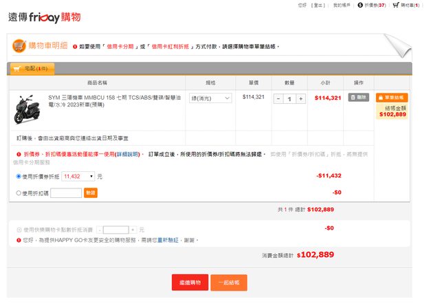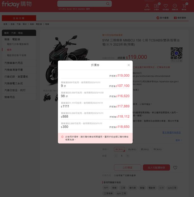 如題 這次Friday購物真的大撒幣 前幾天有一張85折跟88折 有網友說可以買機車 我剛剛看到現在有一張九折券 的確可以買機車 MMBCU算下來不到11萬 https://i.imgur.com/M67rL6G.jpg