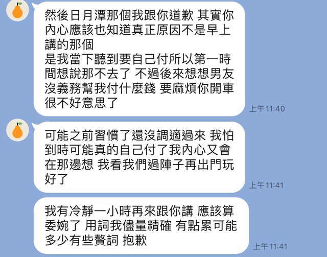 → soyjay : 而且看對話是說 女生已經習慣前任都會出錢的模式 08/22 16:39
