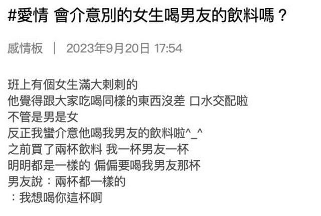 → floabcd260 : 如果是好朋友的話(不分男女)我也會喝他的飲料 09/21 16:01
