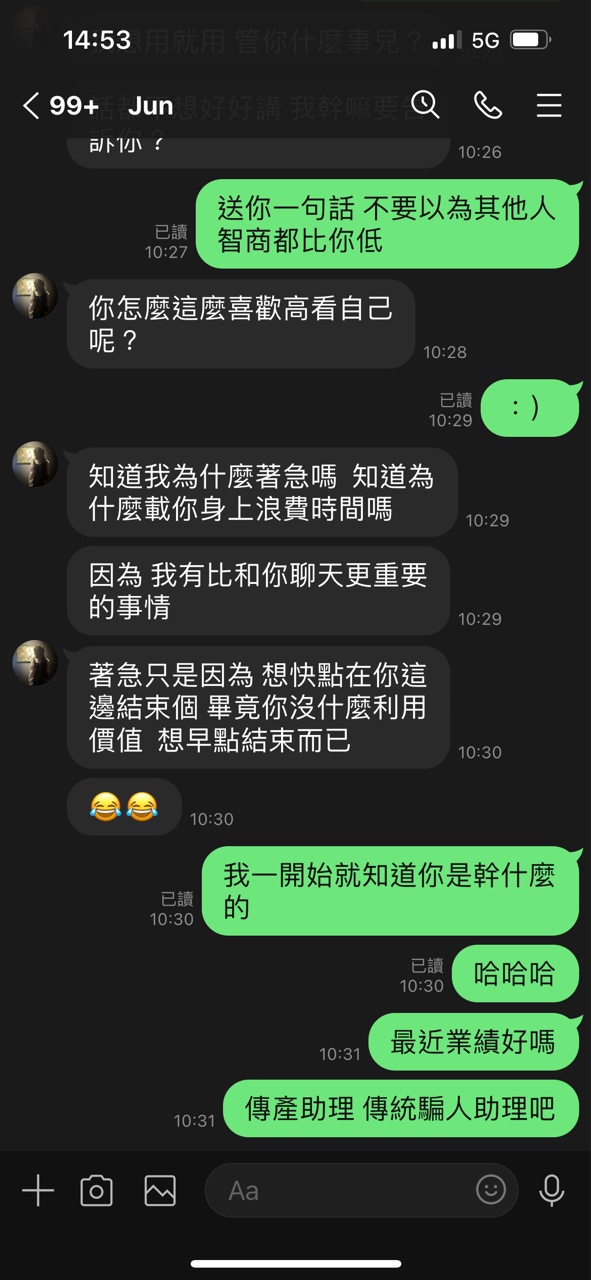 → wn7158 : 不然去夜店喝酒把妹,也比假日浪費時間去看詐騙好06/11 02:43