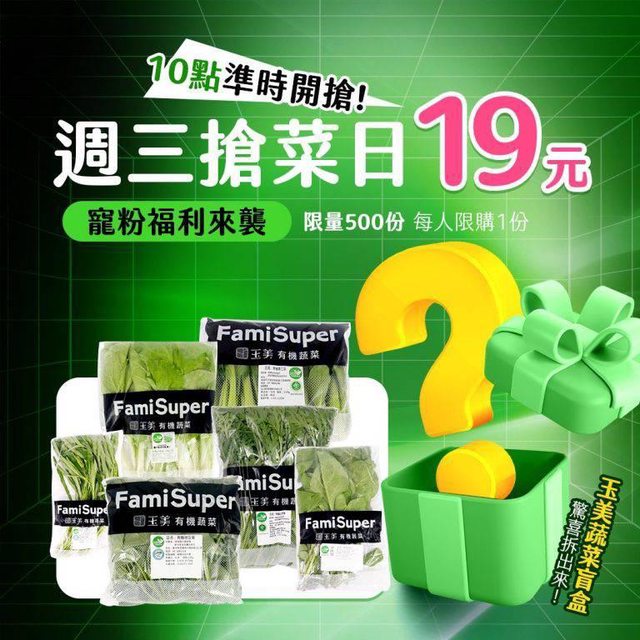 這是全家app的fami煮煮專區,每週三10:00am的玉美蔬菜盲盒活動。