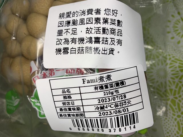 包裝還貼上「因應颱風因素葉菜樹林不足,故活動商品改為有機鴻禧菇及有機雪白菇隨機