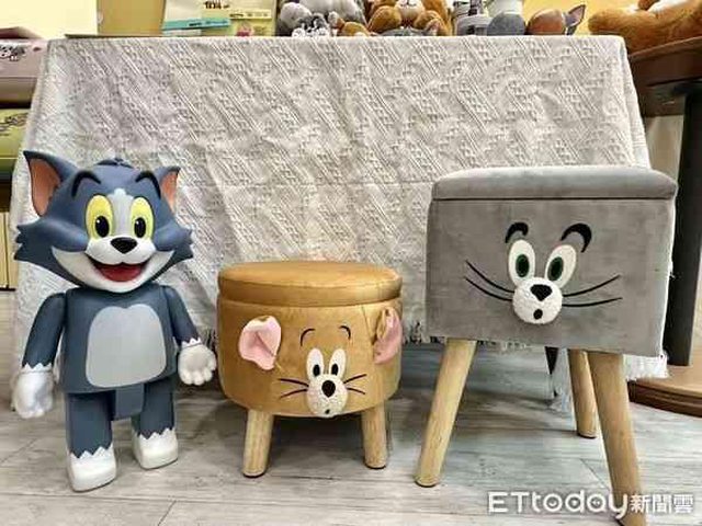 節都可動;中間及最右邊商品為「造型收納椅凳」,分為湯姆貓款與傑利鼠款。