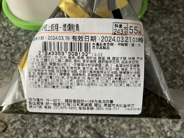 【規格/內容物/熱量】:103公克/海苔.白米.鮭魚/243大卡