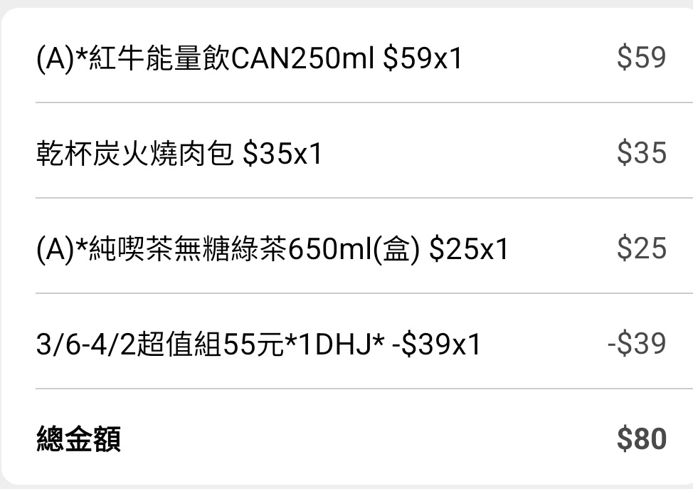 → info1994: 沒有吧 今天我有買 包子+紅牛+無糖純喫茶只要80 04/02 19:12