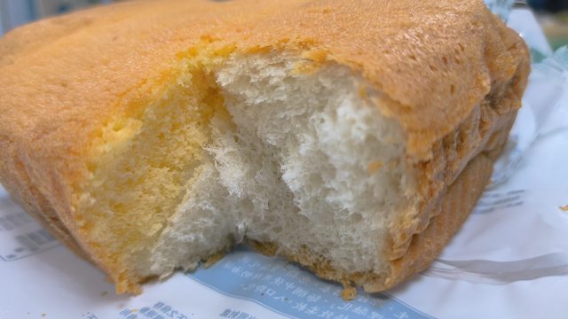 表面類似墨西哥麵包上面薄薄的蛋糕糊,味道清淡,是三排麵包黏在一起烤,中間還有塗餡