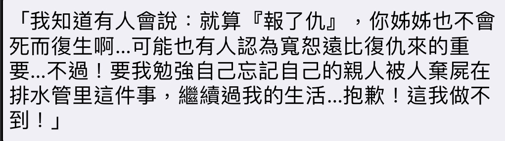 → bidaq: 還放著兇手在外面爽爽殺人 那你只會活得更不爽 03/24 16:49