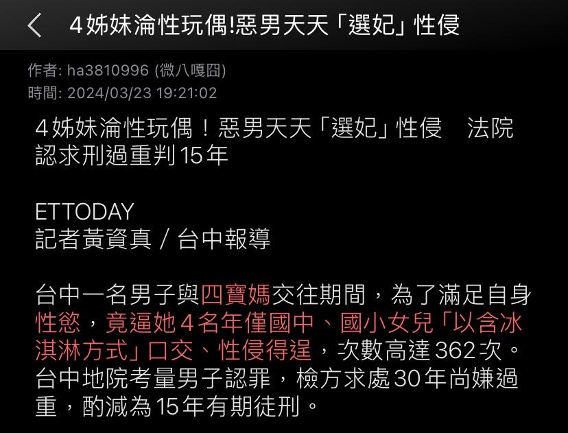 推 xaxa0101: 最近不少性侵未成年的新聞啊,還有一篇性侵同居人女兒好 03/25 09:35