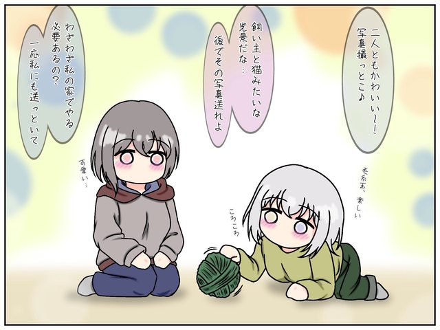 樂:毛線球 好開心(滾動滾動 燈:可愛 愛:兩個人都好可愛呢,趕快拍起來 立:這景象就像是飼主跟貓一樣,之後把照片發給我 爽:有特地在我家做這件事的必要嗎?記得也傳給我