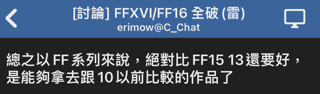 推 roea68roea68: FF16結局也很爛吧 不太保守 TOAR至少乖乖賣糖 03/25 16:47