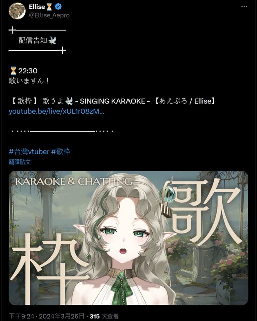 標題[Vtub] Ellise 歌回 歌うよ SINGING KARAOKE 艾莉絲 Aepro あえぷろ