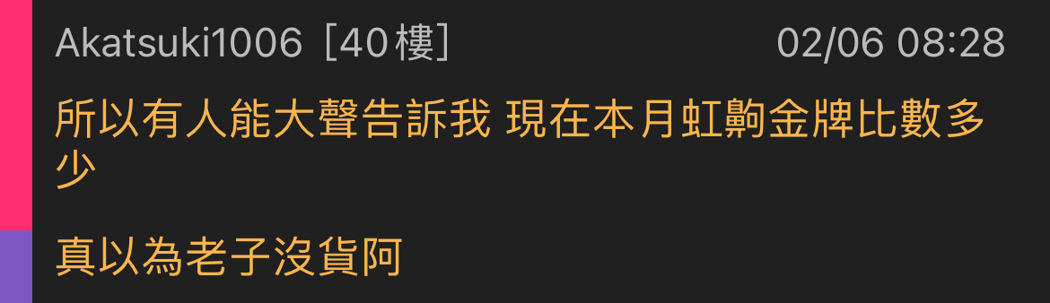 推 coaxa: ㄨㄚˊ 剛看了一下三月到現在虹只有拿到一次金牌,靠的還是 03/28 02:43
