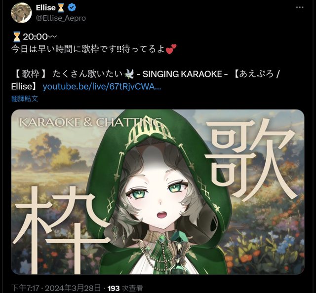 Ellise是日籍台V,唱歌好聽,聲音輕柔,聽起來滿舒服的