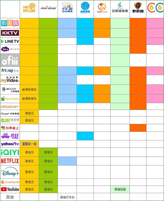 - 黃字:非當季首播但還在播的作品、代理商二次授權。