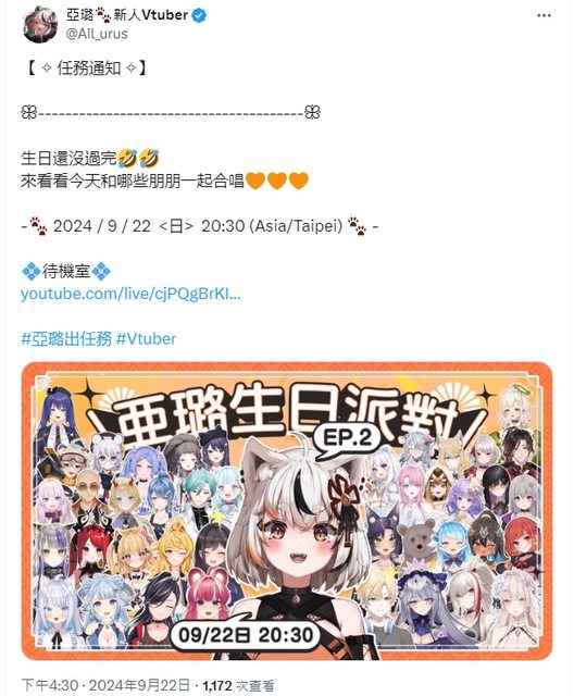 前幾天9/17是亞璐的生日,今天是生日慶祝合唱歌回的第二場