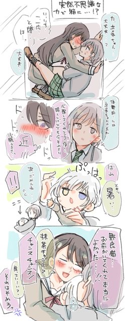 突然又不可思議的跑到箱子內 燈:立、立希沒事吧? 立:沒、沒事,燈呢? 燈:我也沒事。從姿勢來看立希比較辛苦吧? 立(燈在擔心我好溫柔啊好開心但是現在這樣……好近!心跳好吵! 樂:燈,好熱 燈:啊,抱歉 立:野貓,你在這裡真是太好了! 樂:要給我抹茶? 立:給妳!都給你! 樂:可以回去了嗎? 立:千萬不要