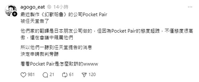 → poke001: 找了一下,這是脆上面的貼文,現在跟帕魯有關的話,連脆 09/24 14:40