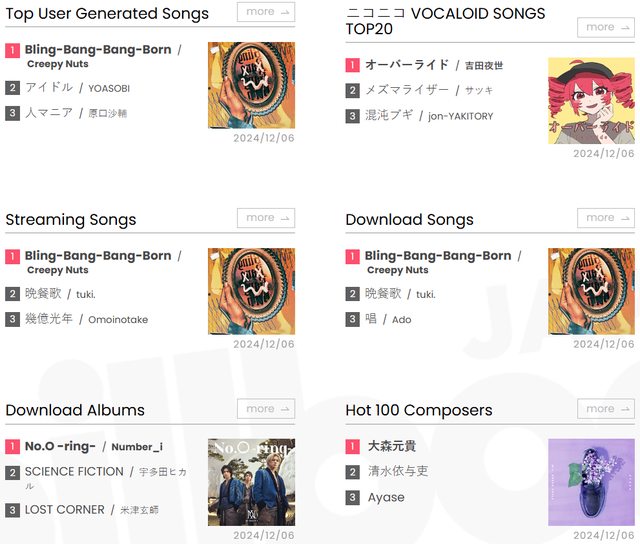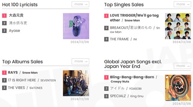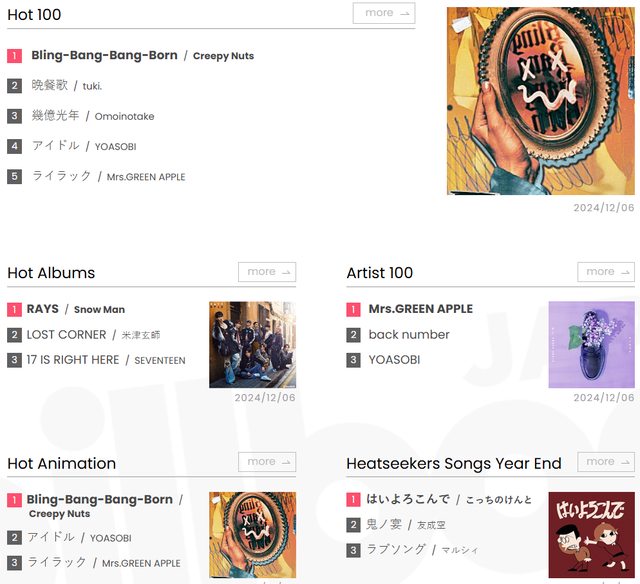 Billboard JAPAN 今日公布了2024年度的年榜