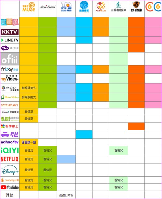 - 黃字:非當季首播但還在播的作品、代理商二次授權。