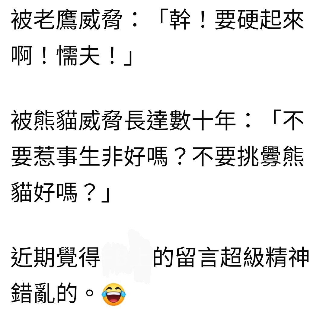推 king9122: 老鷹還能談完還能當人,貓熊談完屈服了會變浮游生物 04/14 12:25