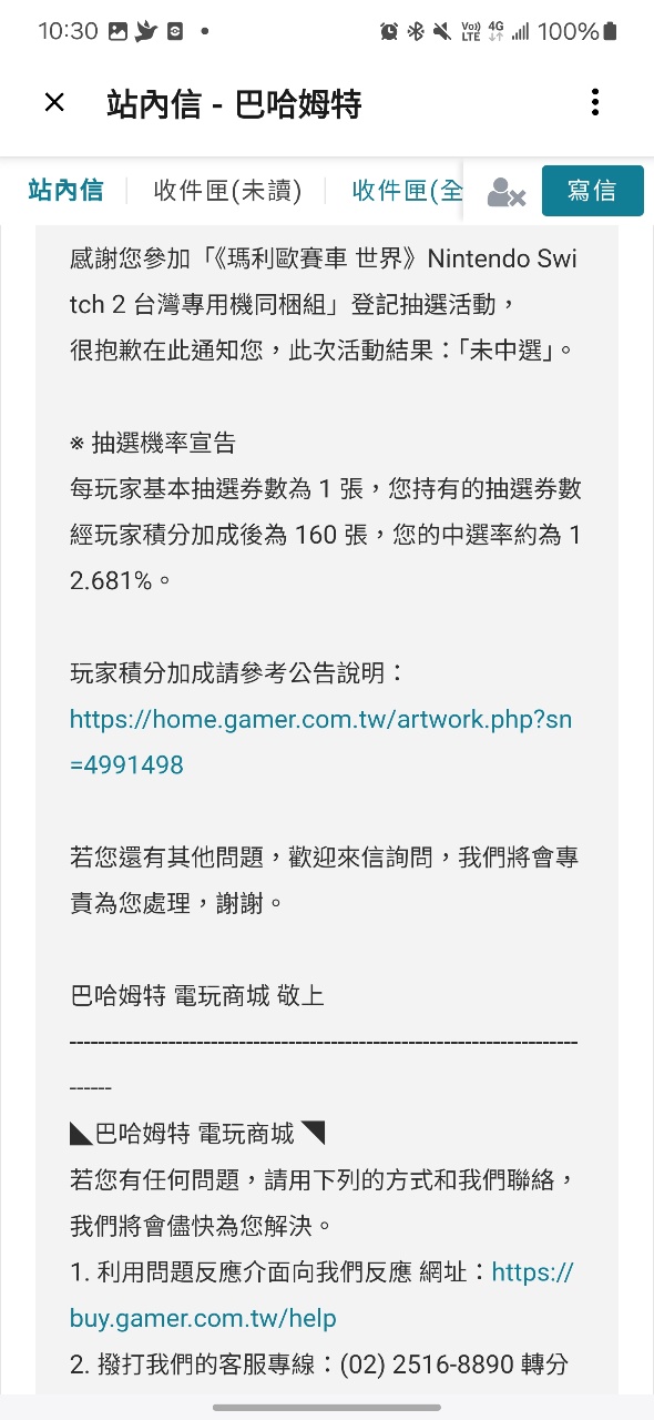 推 ConcealAsh: 會寄巴哈站內信通知你中獎沒 機率多少多少 04/14 10:46