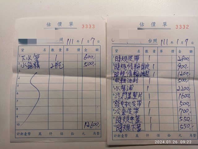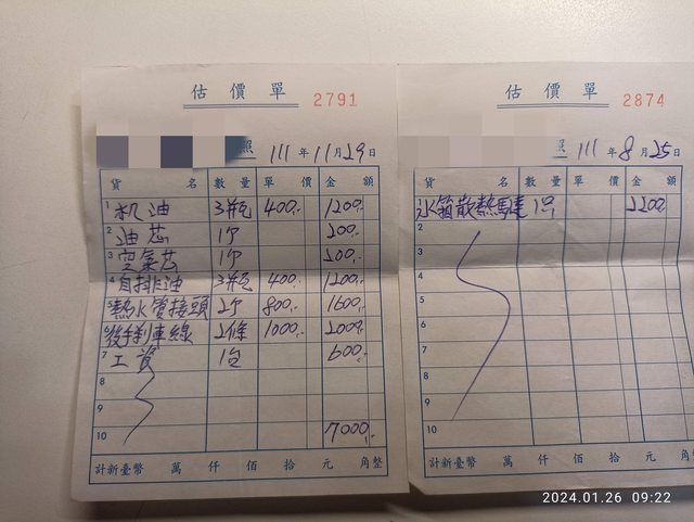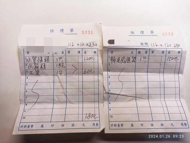 ⑻其餘近二年更換零件如附圖收據(去年12月有更換一個鐵製的水管接頭,老闆說接頭連接