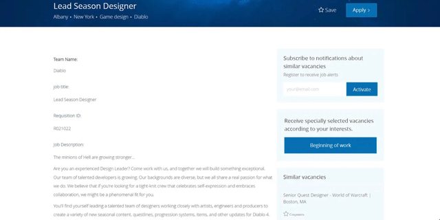 ※ [本文轉錄自 C_Chat 看板 #1aoXC3NX ] 作者: goodday5566 (好天五六) 看板: C_Chat 標題: [閒聊] 暴雪在D4賽季更新被灌爆後 正在招聘賽季 時間: Wed Aug 2 16:25:37 2023 https://tinyurl.com/37a5mz7h 暴雪在第一賽季更新引發的反彈後,正在招聘《暗黑破壞神4》的首席賽季設計師。根據Gam e Rant的報導,這份工作是在1.1更新發布後才開始招聘的。 目前已經找不到這份工作的線上資訊,這可能代表暴雪可能已經找到人填補這個職缺。Game Rant在資訊還沒被撤下前,拍了一張工作內容的照片。 https://i.imgur.com/WAezkpw.jpg