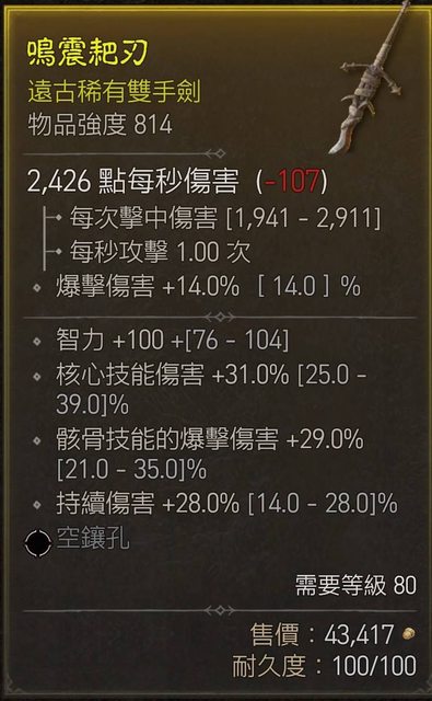 智力 + 100 +[76 - 104] 核心技能傷害 +31.0% [25.0 - 39.0]% 骸骨技能的爆擊傷害 +29.0% [21.0 - 35.0]% 持續傷害 +28.0% [14.0 - 28.0]% (滿) 底  標:300w 暗黑幣 買  斷:3000w 暗黑幣 結標時間:2023/08/08 23:50 (代表23:50為截止線,23:50出價的不算) (若未修正範例結標時間2099/06/01,則視為發文日期+1日的23:50結標) 匯率說明: 出標規則: 1.每次加價最少100萬暗黑幣(可自訂加價價格!) 2.以推文方式競標(含箭頭、噓文) 3.有人出底就不流標 4.最後10分鐘內有人出價,原結標時間自動延長10分鐘且不限次數 (出標規則2.3.4為競標基本條件,沒有特別說明依舊有效,可自訂其他出價規則) -- -- ※ 發信站: 批踢踢實業坊(ptt.org.tw), 來自: 114.44.242.2 (臺灣) ※ 文章網址: https://ptt.org.tw/DIABLO/M.1691458912.A.8C2