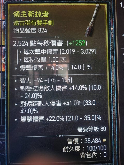 標題[競標] D4 S1 死靈824雙手劍 主屬爆傷