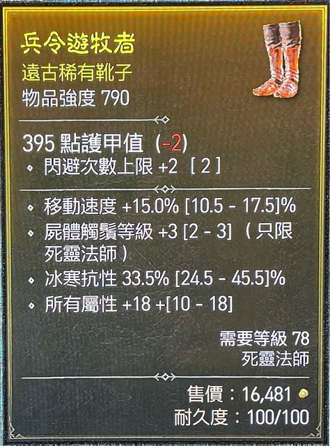 物 品:純召頂鞋 屍體觸鬚+3/移速/全屬/冰寒抗性/閃避次數+2 LV78