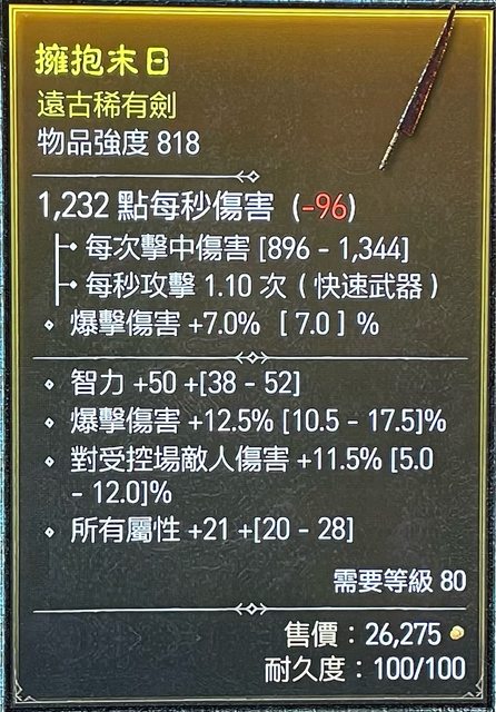 標題[競標] D4賽季 818單手劍 智力/爆傷/全屬