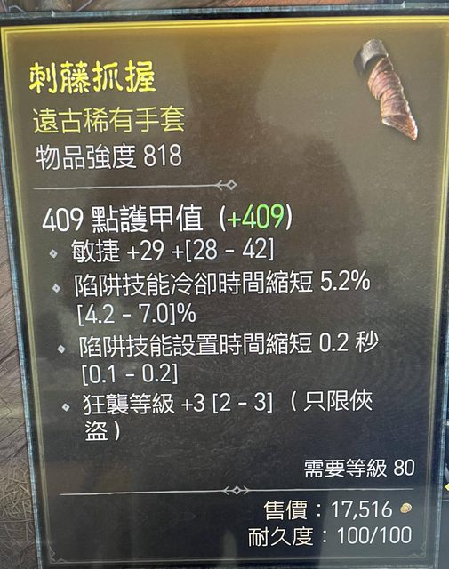 物 品:敏捷 陷阱冷卻 陷阱設置時間 狂襲+3 售 價:100萬暗黑幣(可議價)
