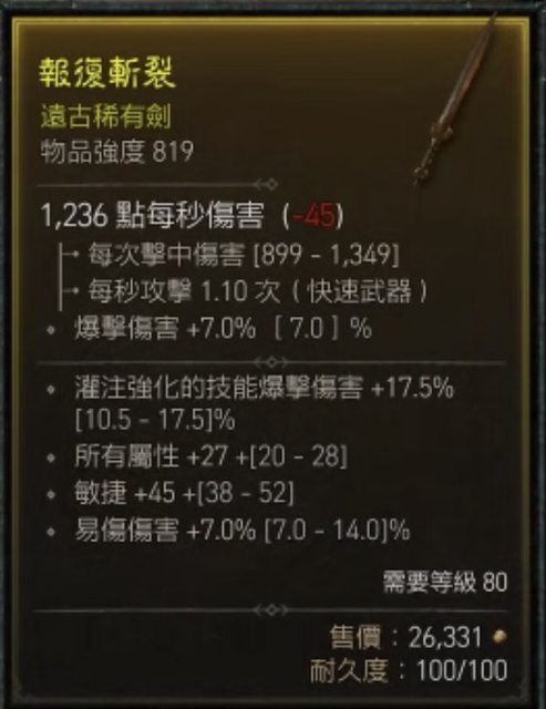 物品:819單手劍 易傷/全屬/敏捷/灌注爆傷