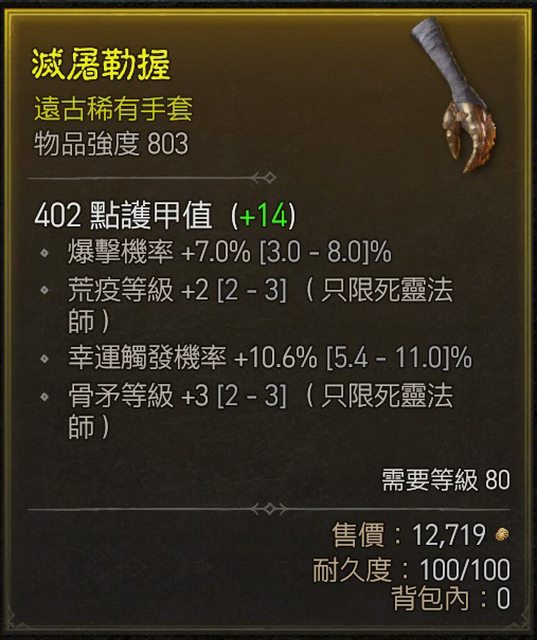 標題[競標] D4 S1 死靈手套 骨矛/爆率/幸運