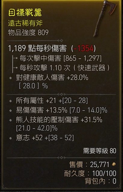 標題[競標] D4S1 809單手斧 頂意志/近頂易傷/全屬