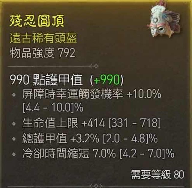 頭盔792 頂屏障幸運 生命 護甲 頂冷卻